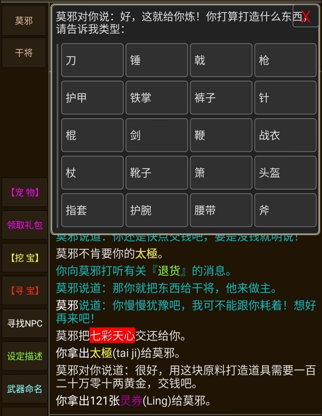 2.如果是其他兵器类武学,那就需要驭雕----铸剑室----莫邪 来打造兵器(切记开光哦)