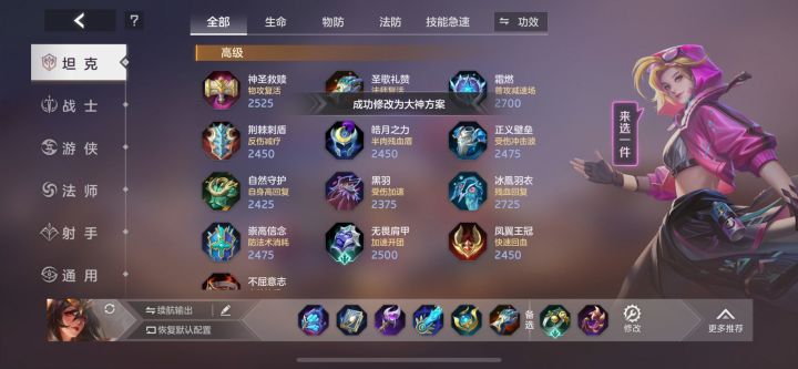 装备:打野刀,风暴之翼(法伤鞋),镜光法典(爆发伤害),阴影权杖(契合被动的多层伤害)碧蓝怒火(提高法强,伤害升华)降魔宝珠(打坦克)圣歌礼赞(复活)