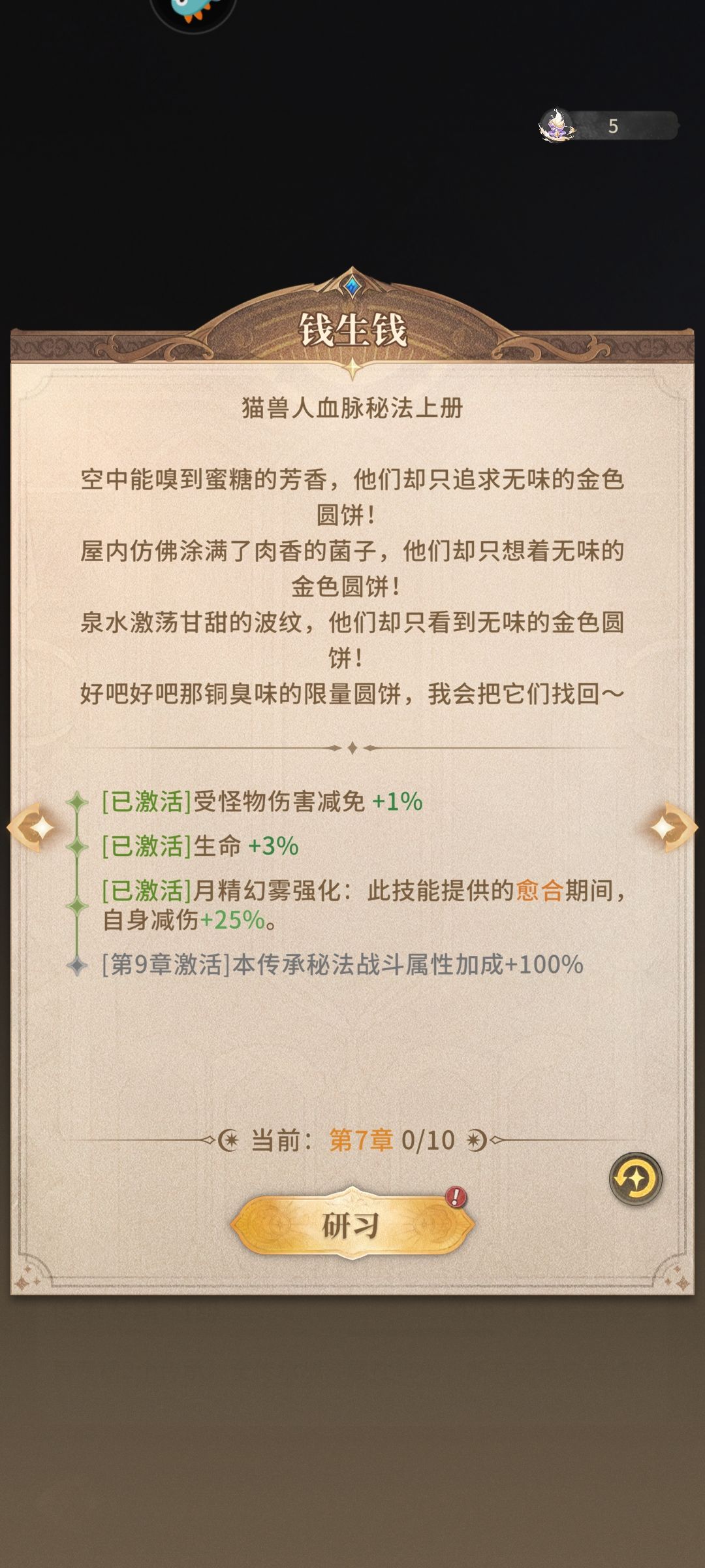 当开启兽人族后,猫刺,兽骑,兽弓为主力等级即可,这里有个变化就是图书馆开启后加点钱生钱触发愈合状态下减伤25%,大大增加猫刺兽骑生存能力!(看附图)
