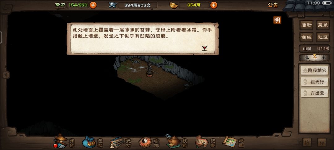 找玉霄子打听雪怪,昆仑泉(8,37)处挖掘,触发回忆。山洞内(6,5)搜索,连续出掌打破石壁。