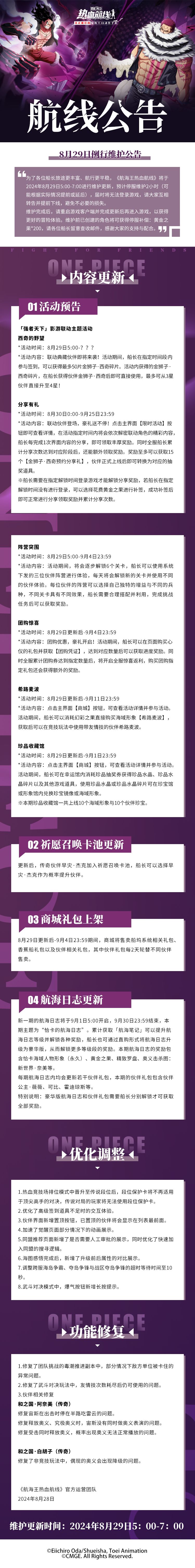 为了各位船长旅途更丰富、航行更平稳,《航海王热血航线》将于2024年8月29日5:00-7:00进行维护更新,预计停服维护2小时(可能根据实际情况提前或延后),届时将无法登录游戏,请大家互相转告并提前下线,避免不必要的损失。