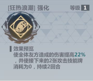 主要通过大招【狂热浪潮】为全队百分比增伤,并且使接下来的2张攻击牌技能点耗费变为0,搭配有高费技能的输出雇员非常好用。