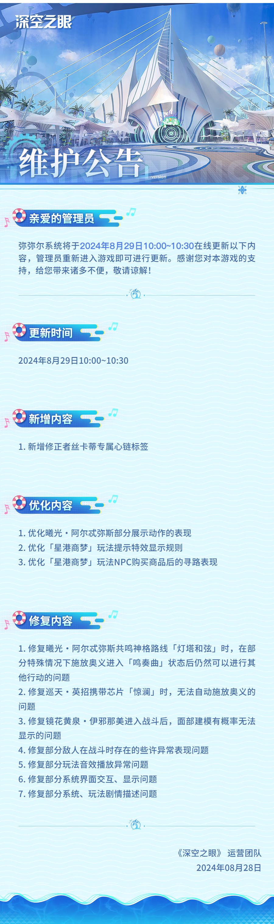 弥弥尔系统将于2024年8月29日10:00~10:30在线更新以下内容,管理员重新进入游戏即可进行更新。感谢您对本游戏的支持,给您带来诸多不便,敬请谅解!