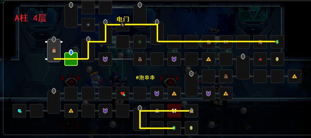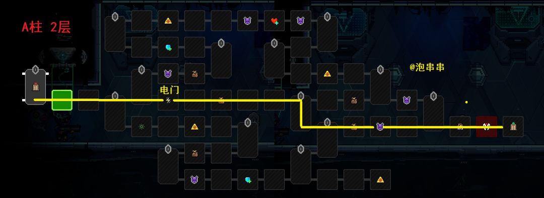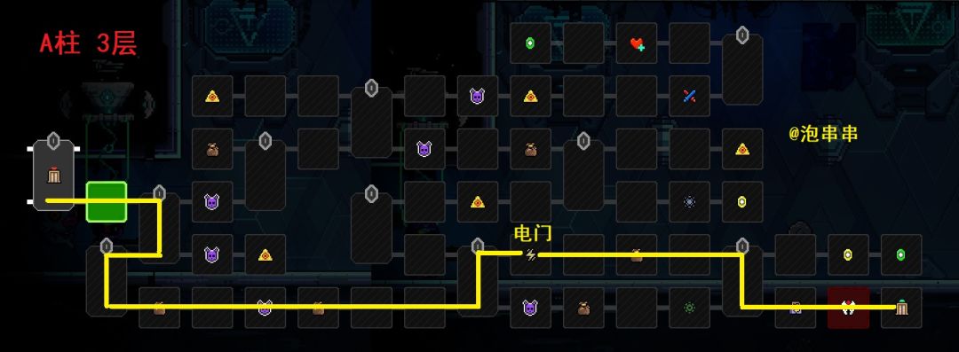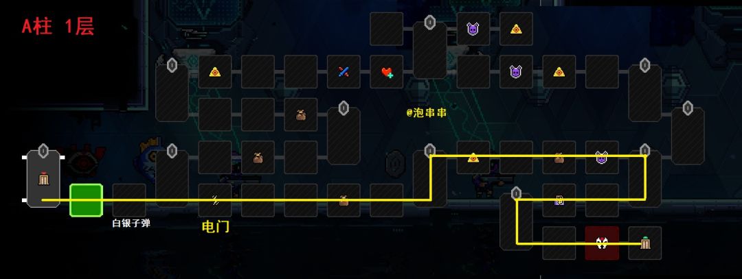 本层吸取1个最低品质,所以要放1个蓝色/绿色品质作为本层祭品。矩阵的A柱都是电门,但开局有白银子弹可以捡,不用担心后续的属性门打不开。