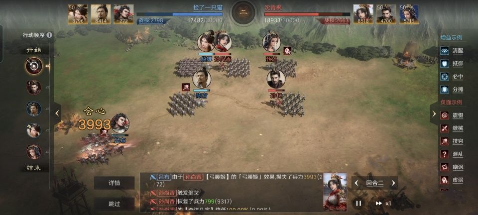 关于这个问题的解答,就要特别鸣谢给本文提供素材的玩家朋友了,他在游戏里的ID名为“沈青枫”。这一听上去就是个武侠气息浓厚的名字,或许他平时也酷爱那些快意江湖的游戏吧。由上图可知,面对着吕布、陈宫和貂蝉组成的白门骑,孙权和甄洛在前,孙尚香在后列起雁形阵,打出了十分漂亮的闪击战。只用了两个回合,吕布就被孙尚香的会心一击给请出了战场。沈青枫是怎样做到如此快速且精准的击杀,就让我们在接下来的段落逐一拆解。