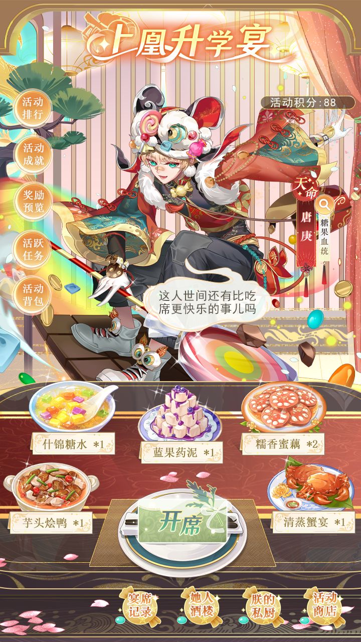 1、8月30日00:00至9月5日23:59期间,上凰升学宴活动限时开启;活动期间,收集食材烹饪菜肴,集齐菜肴开设宴席,亲朋好友可参与宴席哦,参与活动排行、完成活跃任务、达成活动成就,还可获得限时称号与稀有活动奖励,更有机会获得糖果血统天命侍从唐庚及其信物“黑巧板”
