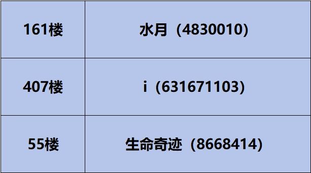 恭喜以下导演在本次活动中获得【公测定档庆典周边礼包】(内含Q版摇摇乐钥匙扣等)*1,请在10月6日前联系场务菜花:3481094118,同时注明来意,并且填写准确详实的个人【收货信息】,如逾期则获奖资格作废。