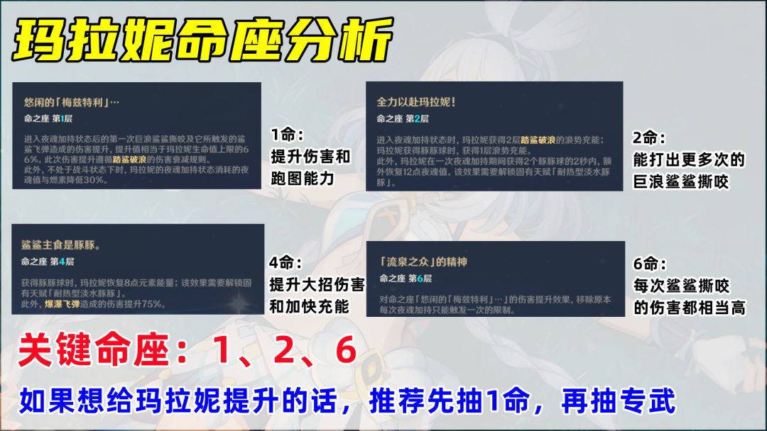 玛拉妮的关键命座是1、2、6命。1命是简单来说就是提升伤害和跑图能力。2命能使玛拉妮打出更多次的巨浪鲨鲨撕咬,也是伤害相关的提升。4命则主要是大招相关的提升,加快充能和提升伤害。6命直接解除1命每轮只能提升1次伤害的限制,让每次鲨鲨撕咬伤害都变得相当高。