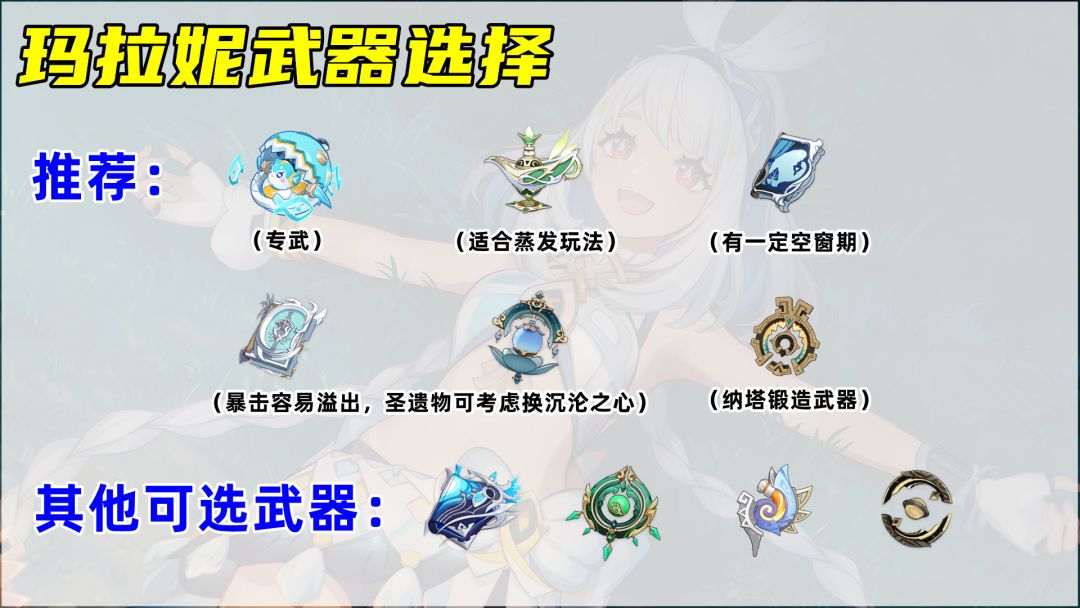 其他武器还可以选择:万世流涌大典(不考虑重击增伤,光看暴伤和生命加成也很适合玛拉妮)、碧落之珑、活动赠送武器苍纹角杯、以及试作金珀等。