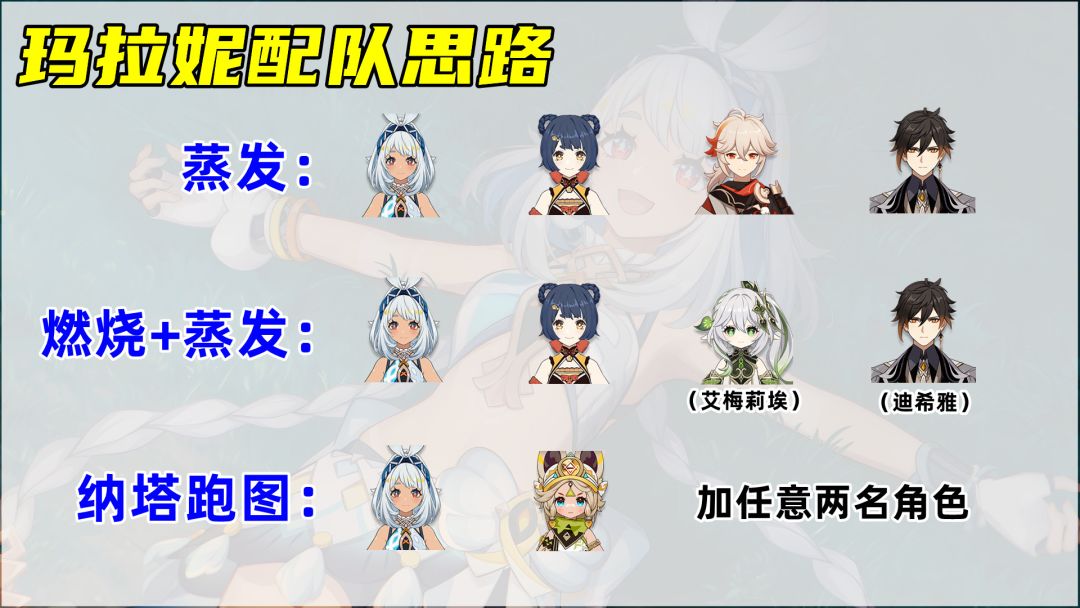 最适合玛拉妮的配队思路是蒸发队,推荐配队为:玛拉妮+香菱+万叶+钟离,推荐配队里至少一位队友带西风武器,来降低充能压力。另外,燃烧+蒸发的配队思路也是可行的,推荐配队:玛拉妮+香菱+纳西妲/艾梅莉埃+钟离/迪希雅。最后是纳塔跑图队,推荐配队:玛拉妮+卡齐娜+任意两名角色。