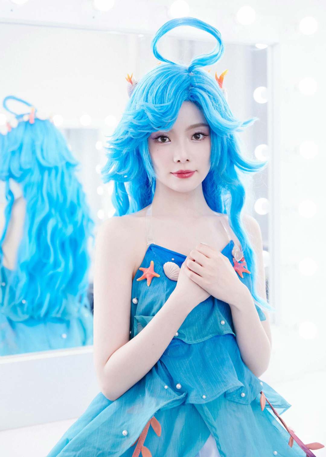 可以看到陈卓璇戴着一头蓝色的假发,波浪卷非常的自然,特别是头上的那个“啾啾”非常的有灵性,可以说非常的还原朵莉亚这位英雄,而且头上的发夹也是贝壳样式的,看着非常的不错。她还穿着一身蓝色的连衣裙,裙子上面还有珍珠,整体来说造型非常的完美。但是玩家们并不认为陈卓璇还原,主要原因还是因为她的妆容不是那么还原。虽然衣服还原,但是她的长相就和朵莉亚的气质不相同。