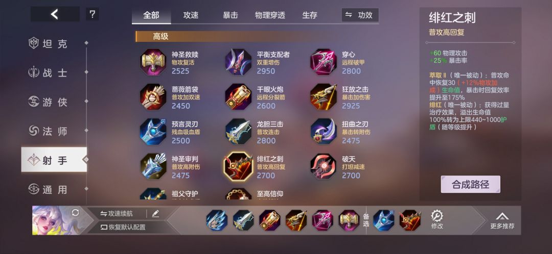 绯红之刺:攻击力、暴击率、吸血、护盾——提升续航和容错