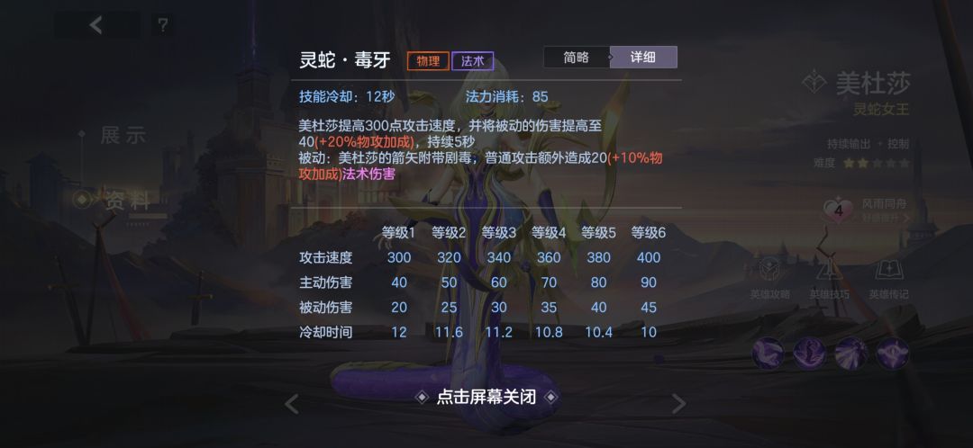 二技能被动效果为美杜莎的普攻会造成额外的伤害,主动效果为美杜莎一定时间内攻速提高并且二技能提供的附伤也增加。二技能所提供的攻速加成以及附伤效果,大大加强了美杜莎的持续作战能力。