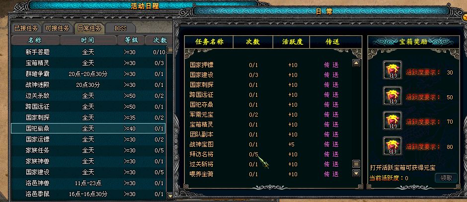 主要有国家运镖、国家刺探、国祀偷鼎、国家远征等。