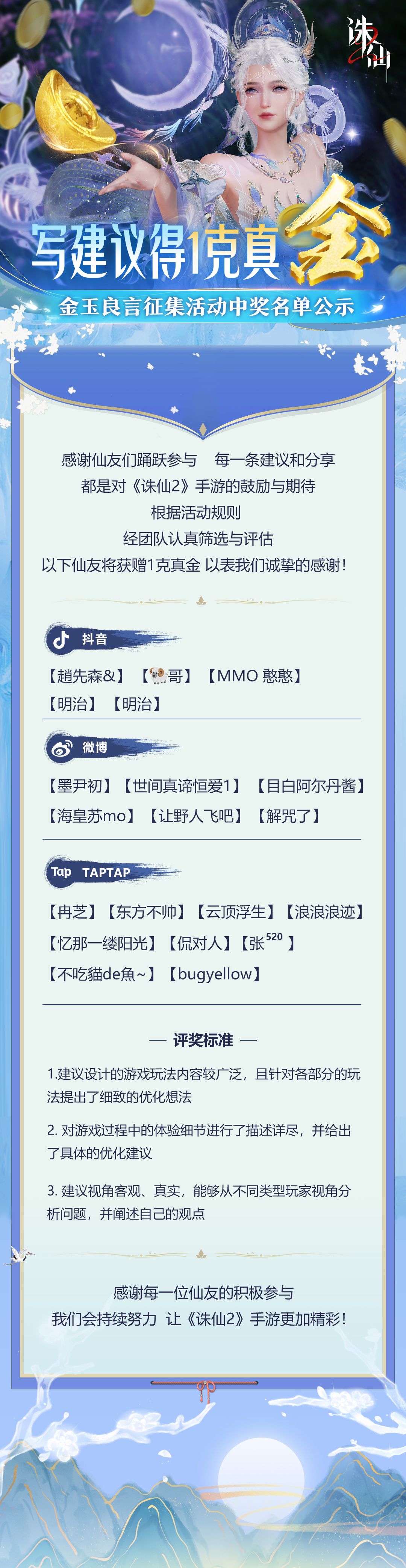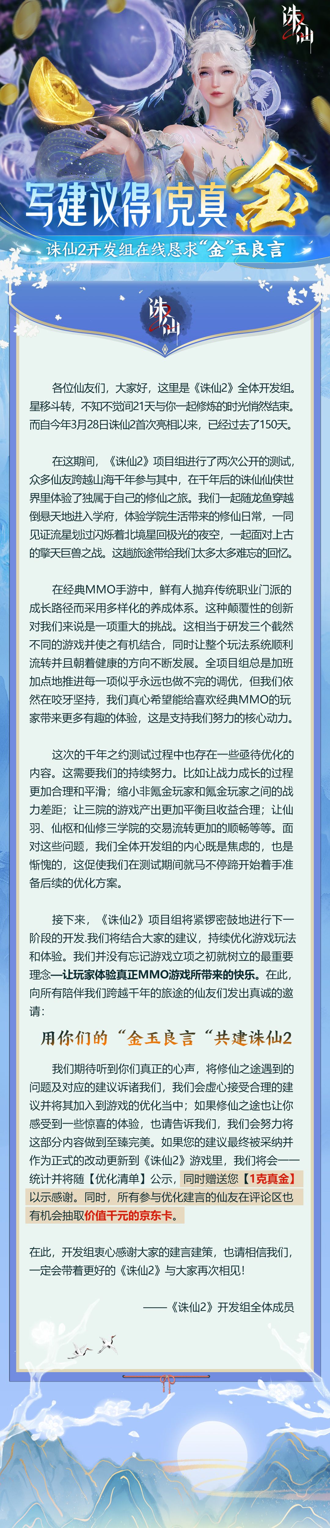 所有获奖仙友都将获得官方送出的1克真金!大家提出的宝贵建议都将在“仙途再启”测试中得到体现。