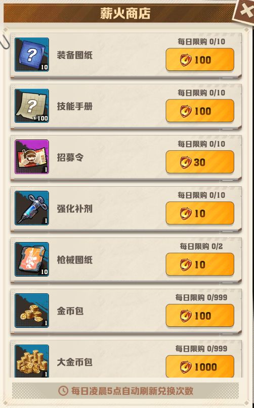 薪火商店作为主线的精英副本,在薪火商店中优先换:金币、枪械图纸、强化补剂,招募令、技能手册(招募令与技能手册在咱们有多余的薪火币,可以考虑换,招募令是为了获取红色超时空,技能手册是为了让燃油弹提高升到26级几率!)