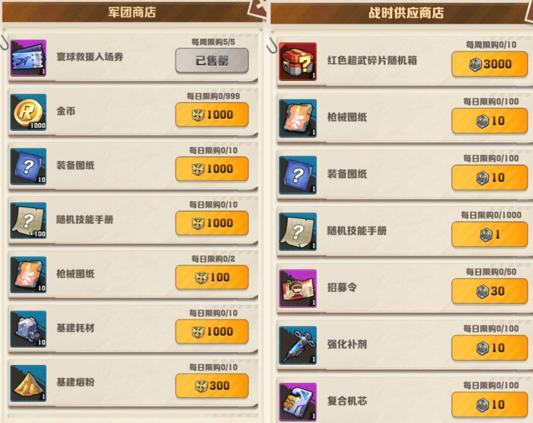 军团商店优先换:寰球入场卷(每周五张必换)枪械图纸、基建熔粉、基建耗材(防线等级拉满可不换)招募令、强化补剂、随机技能图纸。
