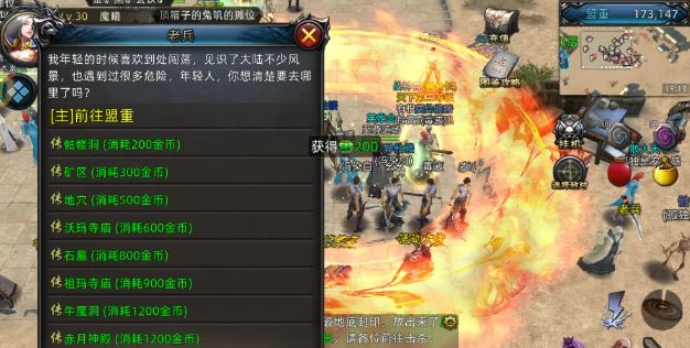 游戏中每天晚上7点到7点30分有烤火活动玩法,只要站在周围每隔5秒就会获得经验值,如果靠近杂货店老板经验还会翻倍增加,前期新手副本找主城右下方的NPC人物老兵,前期主要刷这些图增强实力。该游戏参加boss等限时活动需要手动操作,增加了游戏的可玩性。