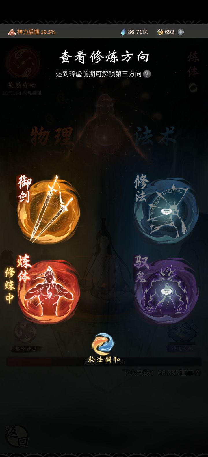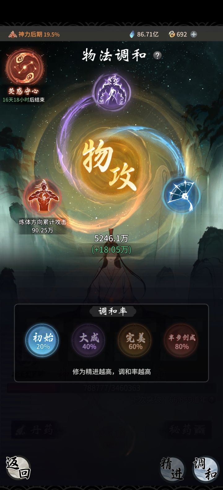 接下来就主修剑法两个方向。这样子真元会比较高。配合不灭的激荡效果能最大程度增加伤害。仙魔方向上目前暂时都可以因为具体的特色加成官方还没出。