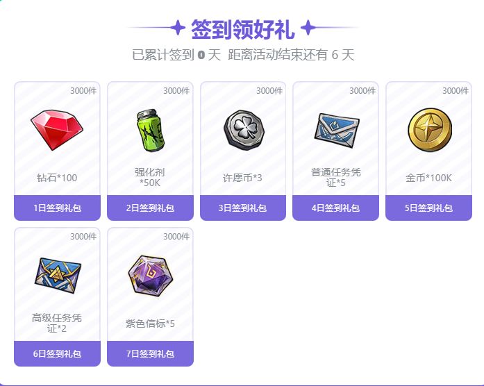 即日起至9月4日23:59,前往TapTap《失落星环》签到集卡活动页面,累计签到可领取共7天的福利!福利包括得钻石*100、强化剂*50k、高级信标*5等,还有更多好礼,登录TapTap签到即可获得,先到先得哦~