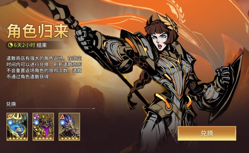 遣散商店有强大的角色返场——皮安赫、哈托、西佩托,在限定时间内可以进行兑换,刷新遣散商店不会重置返场角色的限购次数,遣散币通过角色遣散获得。