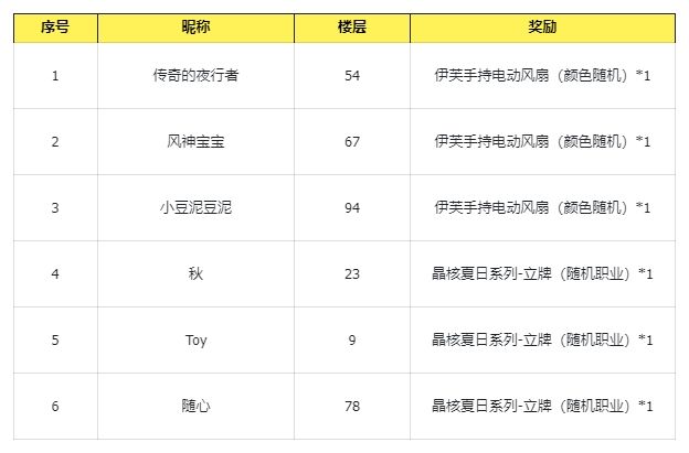 恭喜以下幸运的冒险者获得活动奖励,请中奖的冒险者添加QQ发奖①群:672383967(已满)或②群:875420280登记相关获奖信息,超过7个工作日未登记视为放弃奖励。