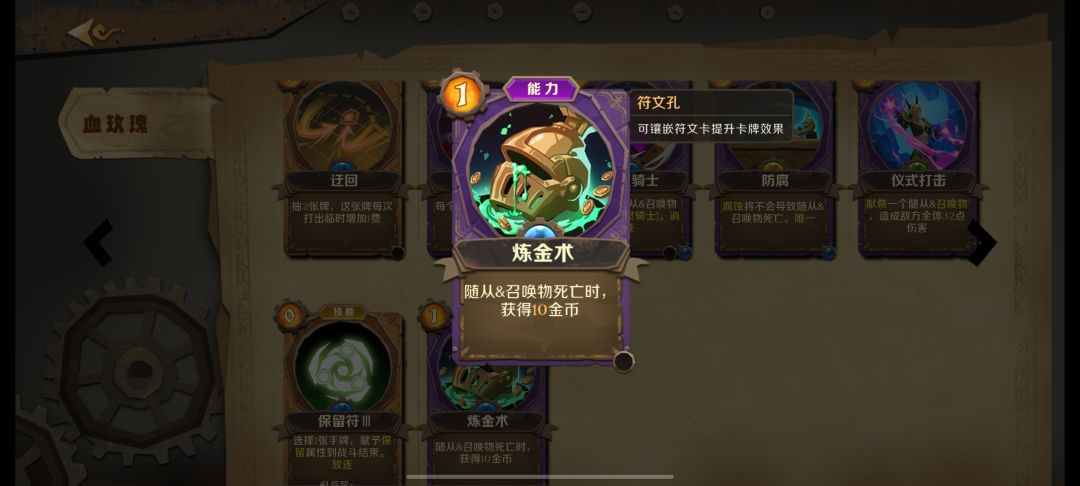 技能点献祭会回两点血的那个,图一是献祭主C随从(优先升四级),图二是副C随从(刷金币),图三是主C卡(重复献祭给主C随从叠力量),图四是副C卡,功能和前面一样,图五看脸,拿到就能金币源源不断,基本不掉血,无伤通关boss