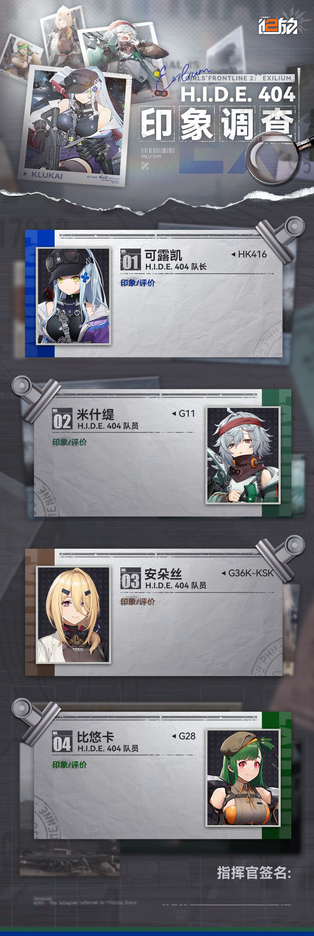 相信指挥官现在对H.I.D.E 404小队的四位成员有了更深的了解,她们的哪一面或哪一句话让指挥官印象深刻?欢迎以文字或涂鸦的形式在图片中分享对她们的印象或评价!