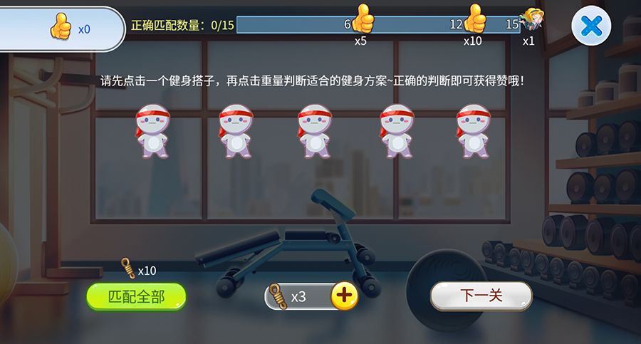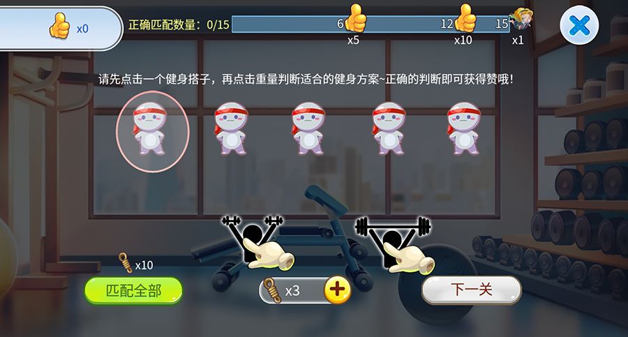 在<分类房间>环节,我们需要点击健身搭子,为他选择适合他的健身方案,是小白是大佬,靠你判断啦!~注意:这里是赢得赞赞的环节,完成后进入<锻炼>看看啦~