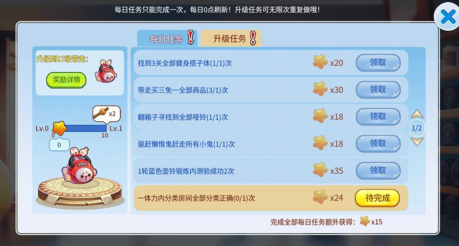 每日任务、升级任务,努力完成它们,获得星星进度!