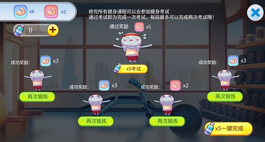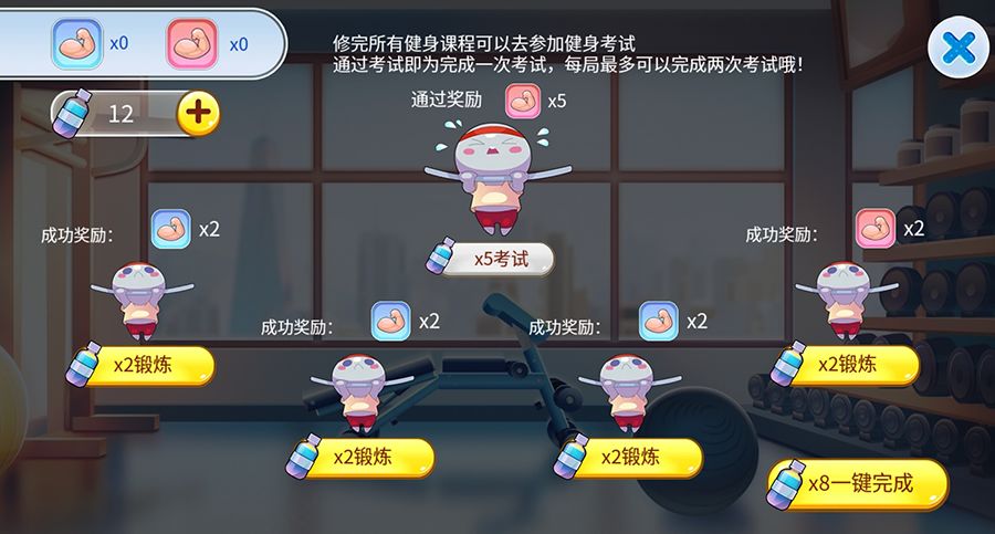 选修健身课程,完成后点击<考试>按钮进行考试,成功后获得蓝色、粉色力量,之后可以到领奖处兑换奖励~
