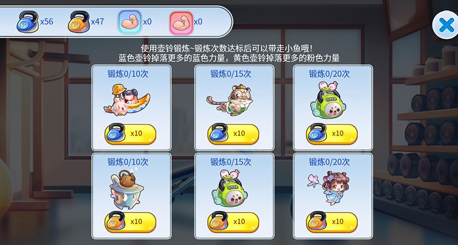 选择你喜欢的鱼儿,使用壶铃开始锻炼!