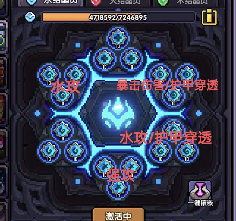 副属性洗练建议6-9个元素穿透、6暴击伤害、3水攻(缺少护甲穿透的优先洗练)