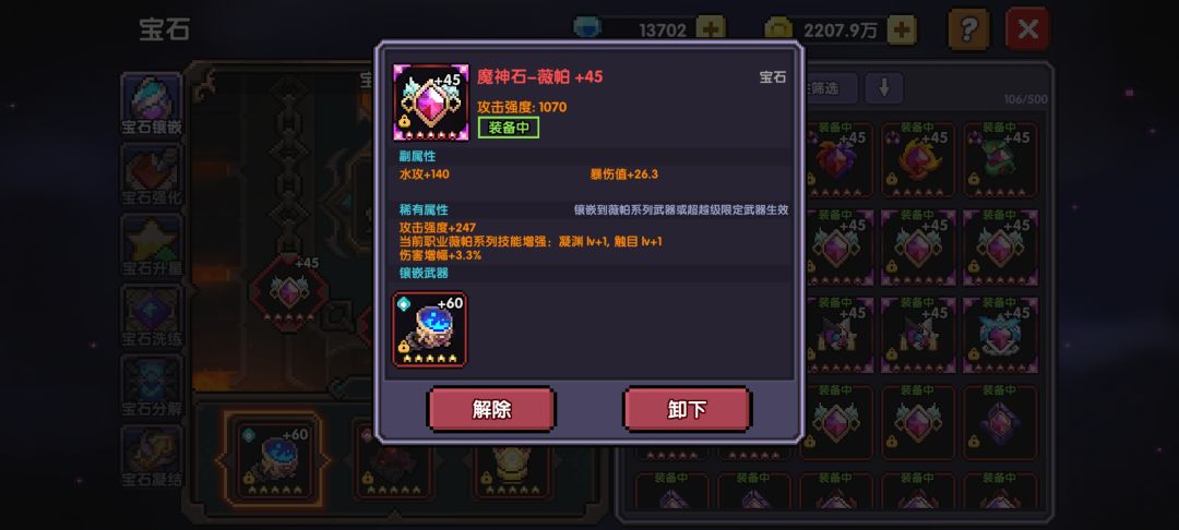 因为打内桩宝石的稀有属性中 护盾伤害 克制 压制都是没有用的所以我们尽量选择微帕技能、伤害涨幅、水攻、强攻、暴击值这几个,优先肯定是技能+伤害涨幅,技能如果提升到了80就优先伤害涨幅+水攻,