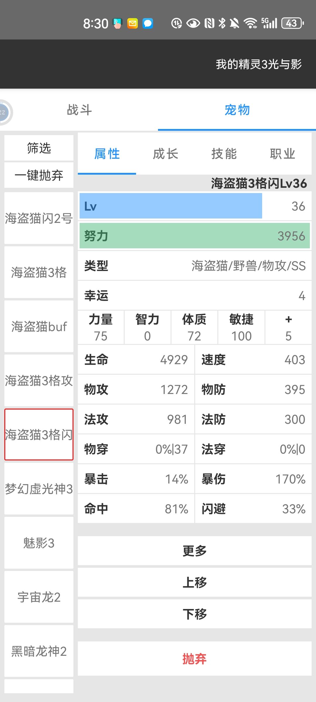 加点的话闪避高的【加100敏捷】,再加【力量】。闪避不高的直接全加力量就行。大概闪避有30%就很抗揍了,没有30%也没关系,无非多练点级而已,当然你也可以重新抓。