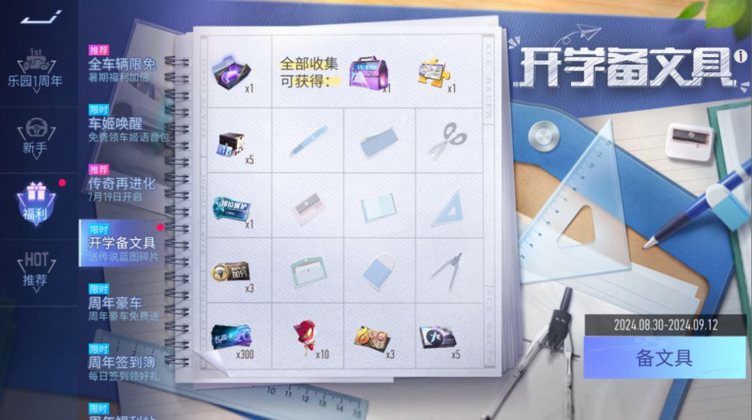 8月30日~9月12日,各位车手每天都有一次备文具的机会,每次会随机获得一件文具,且不会重复获得。点亮同行列内的3件文具后,即可领取对应行列的奖励。点亮全部文具后还可以领取传说蓝图碎片!奖励多多各位车手一定要记得每天都来备文具呦~
