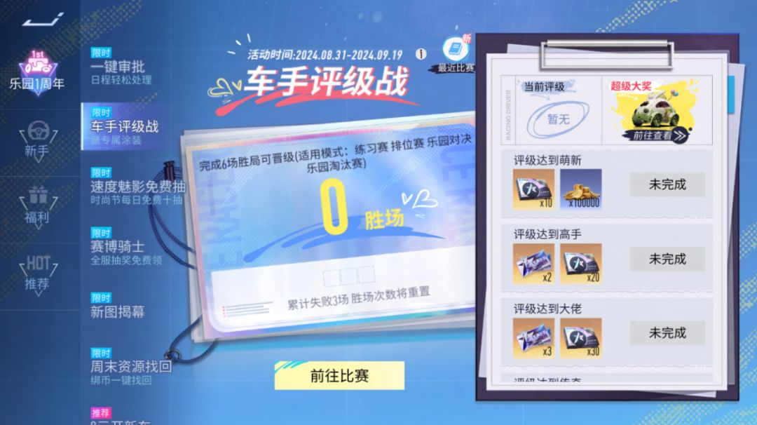 评级赢涂装:8月31日~9月19日,速度节大舞台,有实力你就来!参加车手评级战,赢王牌补给券、团子涂装-抹茶冰淇淋和专属称号!