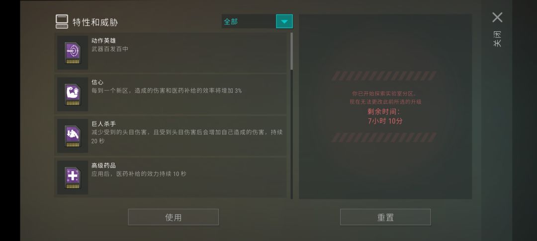 c:在一楼生物填充罐旁边还有一个芯片插槽,插槽数量可通过升级生物填充罐来解锁更多,当前版本最高3个,可以选择添加增益或者屏蔽威胁(添加的增益在二楼选择时有概率刷到,屏蔽的威胁则是在本轮实验室中100%不生成),个人推荐优先选择屏蔽,屏蔽的收益更加稳定。芯片可以通过实验室声望等级提高来解锁(所有的芯片除清打扫房间,巨人杀手均为随机抽取)。注:一旦在二楼扫描之后即使未选择增益,插槽也会锁定,直到开启困难模式或者实验室刷新