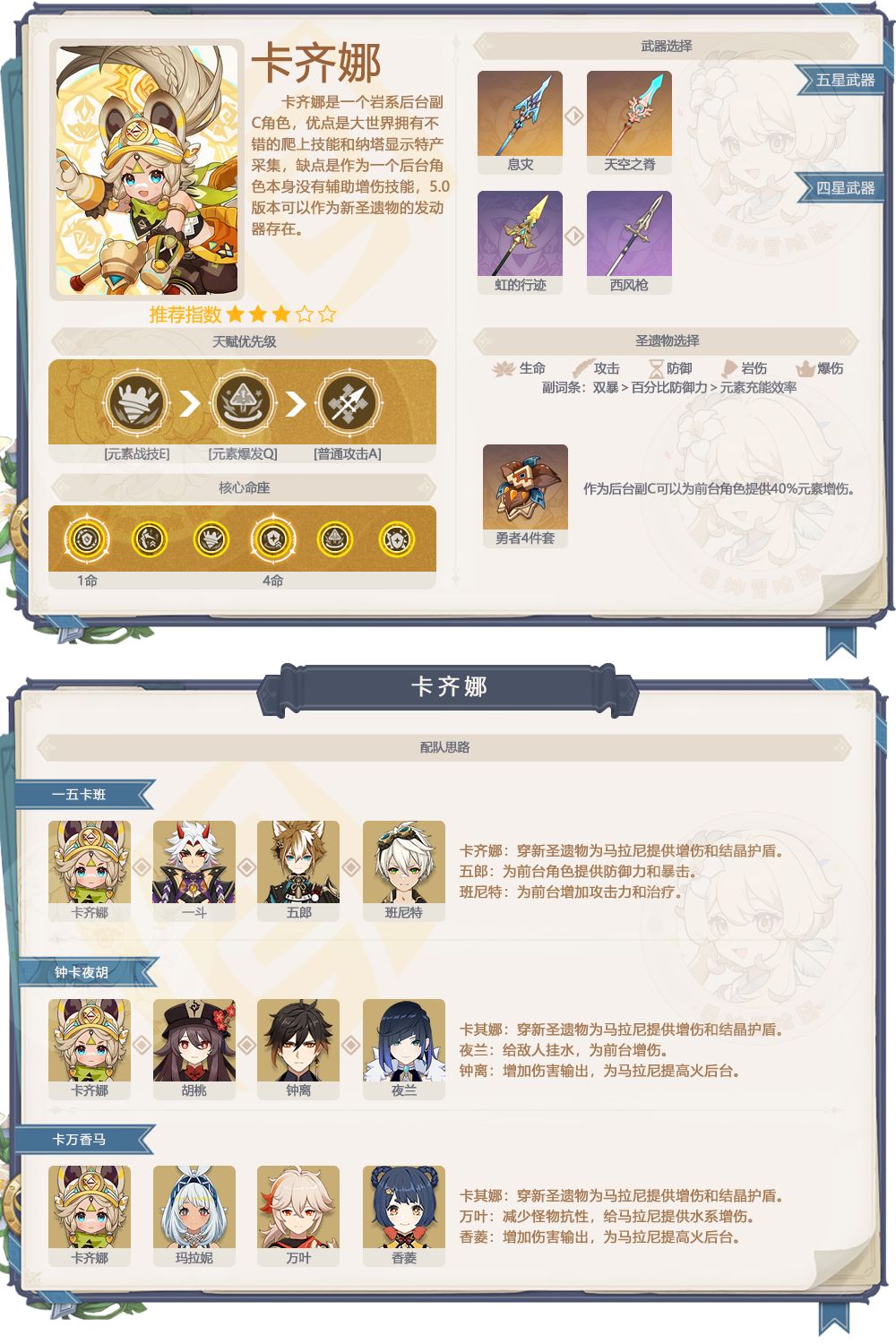 3、卡齐娜抽取建议:参与纳塔主线即可免费获取一位,有着不错的大世界能力,人设也很可爱。带着她在纳塔跑图体验非常好。不需要特意去抽命之座