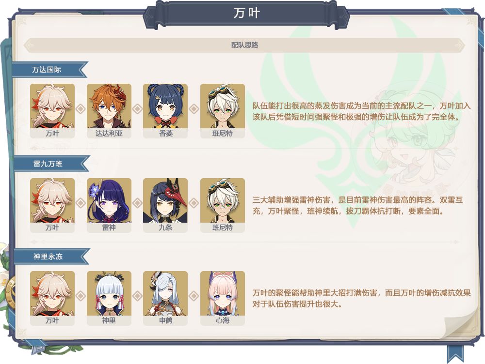 2、枫原万叶抽取建议:推荐抽,必抽一只,无论是大世界还是深渊,每一期,必上的角色,就上12层不上,在11层也必会上,就是这么好用的聚怪增伤角色,顶级人权卡,纳塔也不会落后,强的不止是风套,是他的聚怪,命座方面不推荐抽,米多可用考虑2命,2命给的精通对于打反应的角色,像玛拉妮,万达这些都是非常大的提升