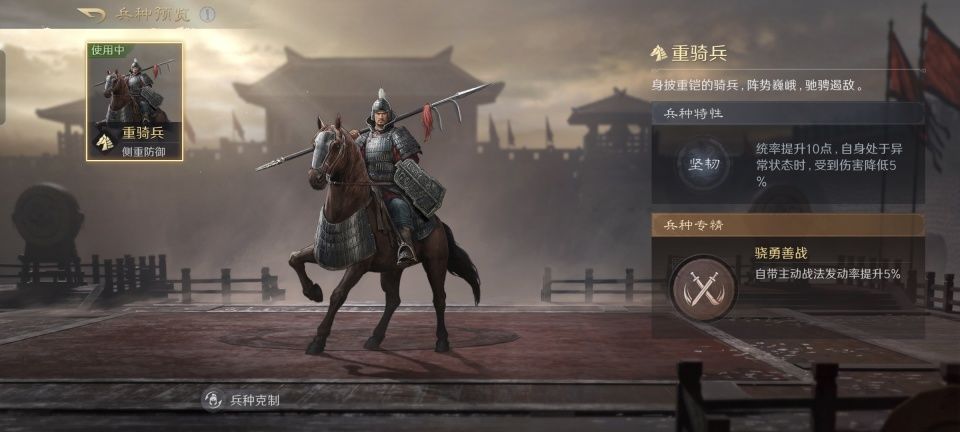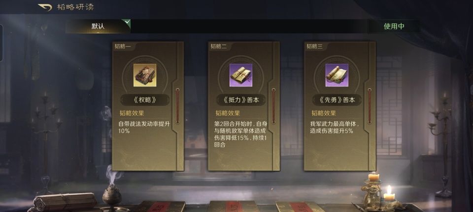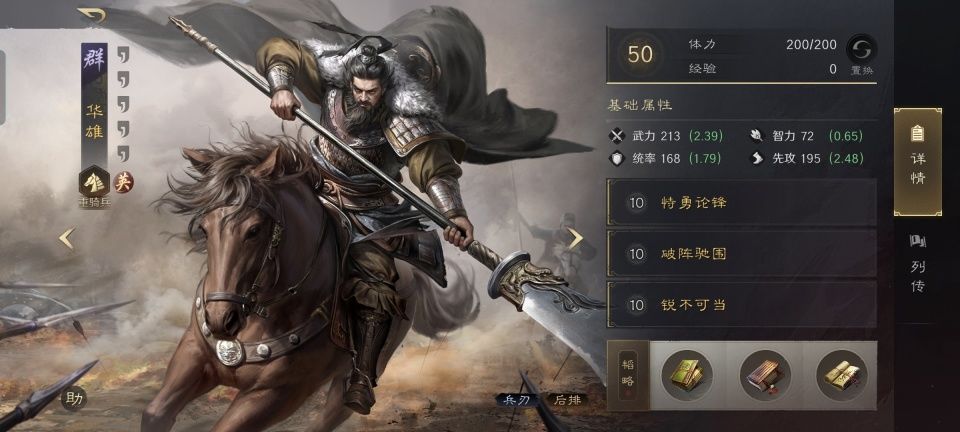话本华雄战法:恃勇论锋+破阵驰围+锐不可当。韬略库:神武(专属)+作战善本+胜战善本。重骑兵特性坚韧,专精点亮骁勇善战。算上阵型的加持,在战斗的前四回合,华雄的兵刃伤害总共额外提升了31.5%。骁勇善战的重骑兵额外提升了5%的自带主动战法发动率,故而恃勇论锋的发动率达到了70%。