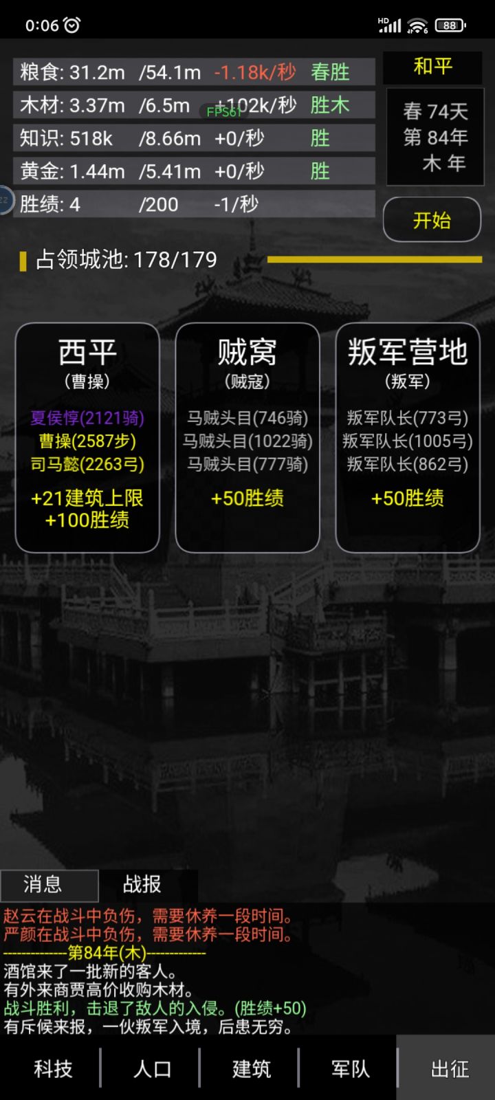 前期留几个农民,其他全樵夫,保证伐木,住房等级是军备,兵营的2倍,每次水,金年前一年把学堂,矿场升到和军备同一等级,水年升科研,金年爆兵,存黄金,注意每次尾数为9年冬天要爆满兵。中期伐木比军备高百来级,市场升到要消耗的资源比军备升级消耗高,基本就不缺黄金了,矿场可以不再升,科研不多,学堂后面不用升。后期还有20城左右,700级伐木,500级军备时,全力升军备,市场不用升,金年存点黄金已经基本够用。只有后面5关是必定要打2次才过的