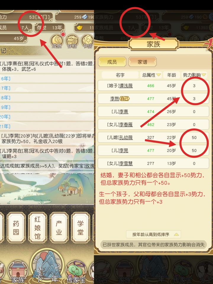 生一个孩子,父和母都会各自显示+3势力,但总家族势力只有一个+3
