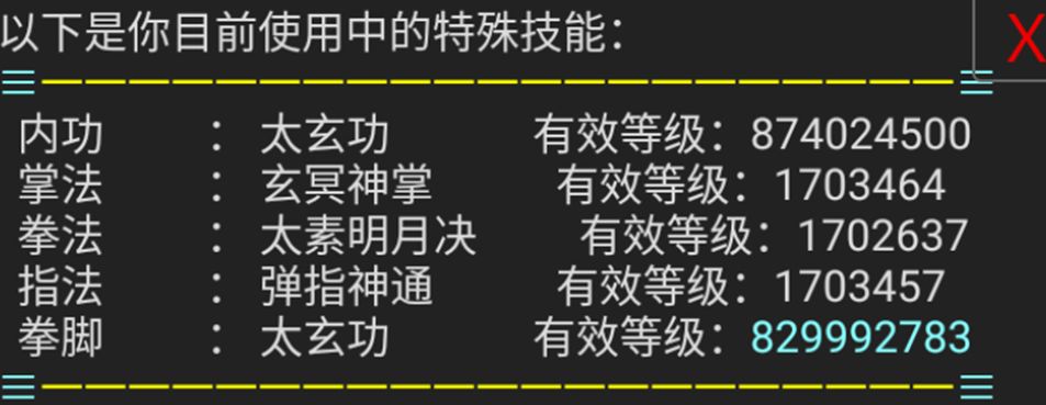 - 《葵花魔功》-群魔乱舞,激发为指法,一体功,用法同《太玄经》,普攻可触发多连,命中高,出手快,cd5秒。无限制五绝令中四大宗师武学之一。