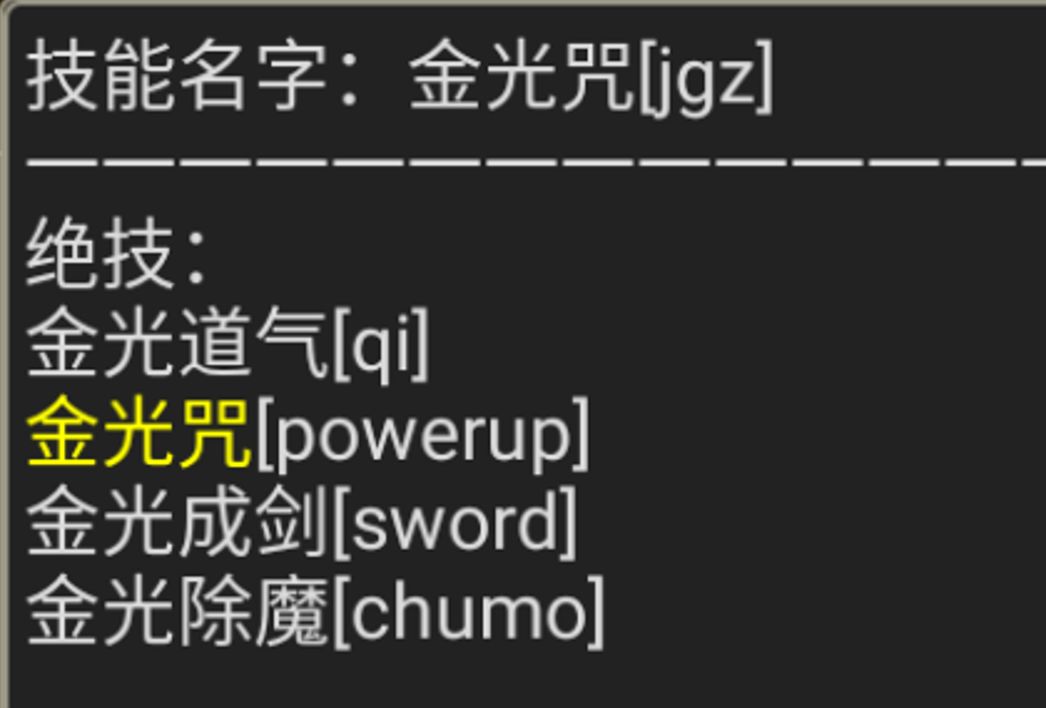 金光咒【powerup】:伤害战气,增加三倍内功的攻击,招架,轻功,剑法,枪法,刀法,拳脚,后天四维属性;