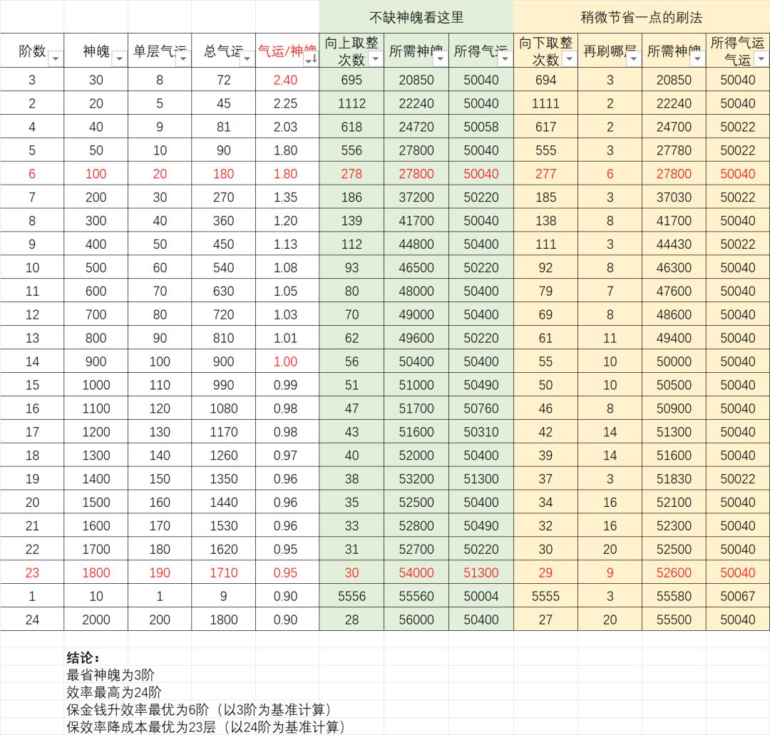 - 该表通过统计每层所花神魄与所得气运值,二者作比,进而得出刷3层最节省神魄,24层可获取最大效率。又通过计算分析得出,刷6层可在节省神魄前提下最大化提升效率,刷23层可在保证效率前提下最大程度节省神魄。此表仅供参考,各位各取所需,游戏愉快。