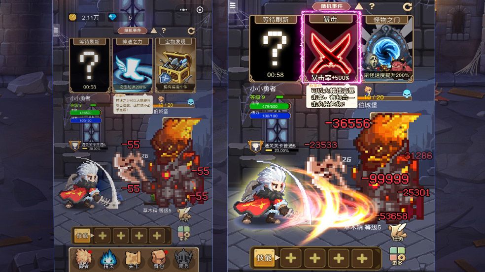 因为咱们是放置游戏,不需要玩家在战斗的过程中进行复杂的策略抉择,也不考验大家的操作意识,硬说有什么需要操作的地方,那就是角色的养成配置。通过选择不同的事件卡进入事件,让勇者获得某些能力的提升,积累这些操作,逐渐完成“变强”的过程。
