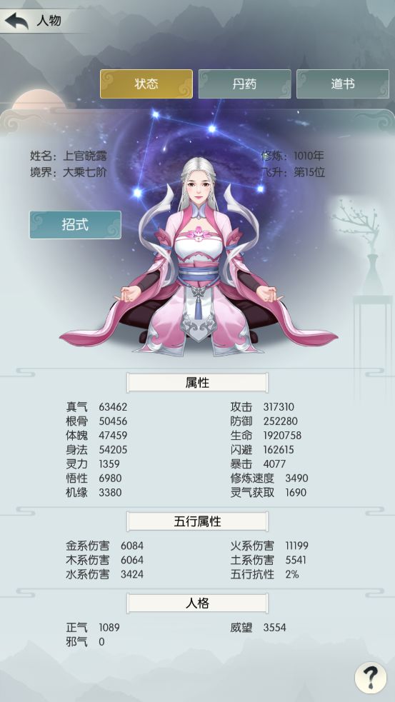 真气:63462,根骨50456,体魄47459,身法49205