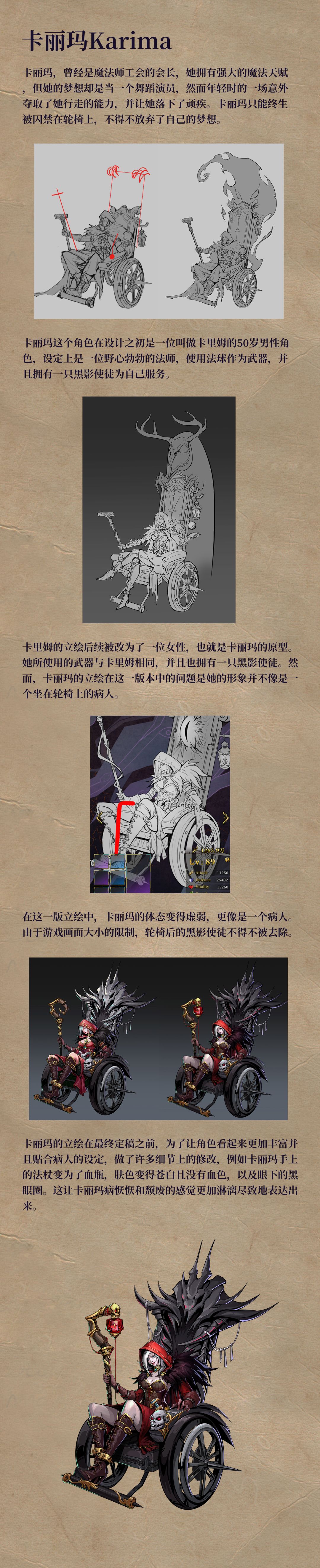 卡丽玛的立绘在最终定稿之前,为了让角色看起来更加丰富并且贴合病人的设定,做了许多细节上的修改,例如卡丽玛手上的法杖变为了血瓶,肤色变得苍白且没有血色,以及眼下的黑眼圈。这让卡丽玛病恹恹和颓废的感觉更加淋漓尽致地表达出来。