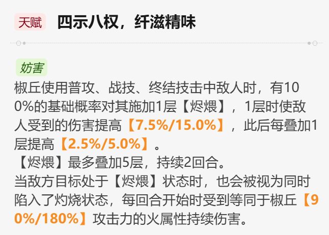 当椒丘使用普攻、战技、终结技时有100%的基础概率为其施加一层【烬煨】,天赋升满的情况下第一层【烬煨】提供15%的易伤,后续每层5%,叠满五层一共可以提供35%的易伤。【烬煨】效果一共持续2回合。当敌方目标处于【烬煨】的状态时,会视为陷入灼烧效果,但是低星魂椒丘造成的灼烧伤害有限,只有抽到二星魂才会有明显提升。椒丘所提供的易伤区在崩铁里非常高贵,不容易被稀释,上一个能够施加群体易伤的角色还是桂乃芬,由此可见策划对易伤区的重视。【烬煨】属于负面效果,所以可以为黄泉叠加【残梦】。